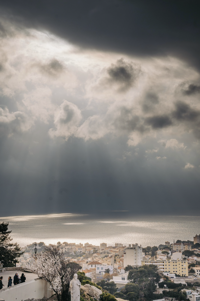 Quelques heures plus tard le voile est relevé. Accroché sur les hauteurs qui veillent sur la côte, couronne d’argent et de coton déposée là pour que le soleil retrouve sa fiancée en contrebas. Il embrase les galets et transperce l’eau qui se parent de ses plus beaux turquoises pour le séduire.